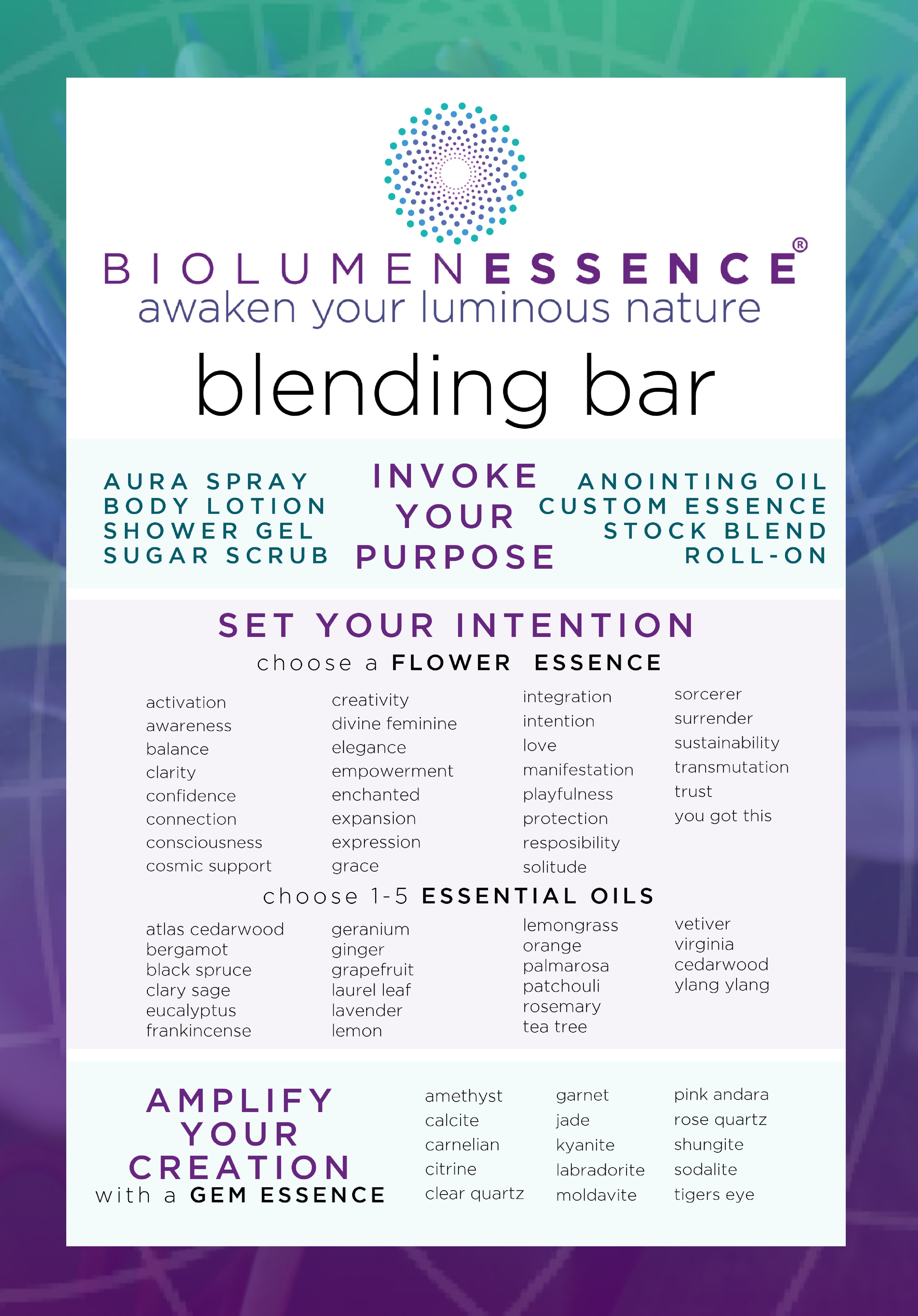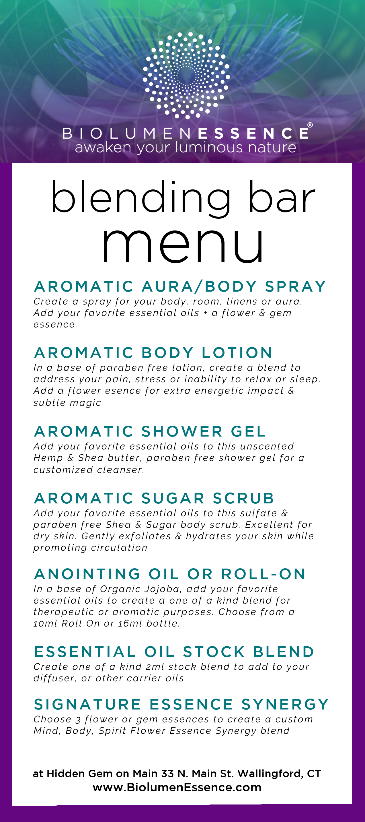 BiolumenEssence's Aromatic & Botanical Blending Bar is a hands on, sensory experience. It is an activity in self empowerment & manifestation, leading to the creation of a product that supports the deepest parts of you, while aligning to your highest destiny.