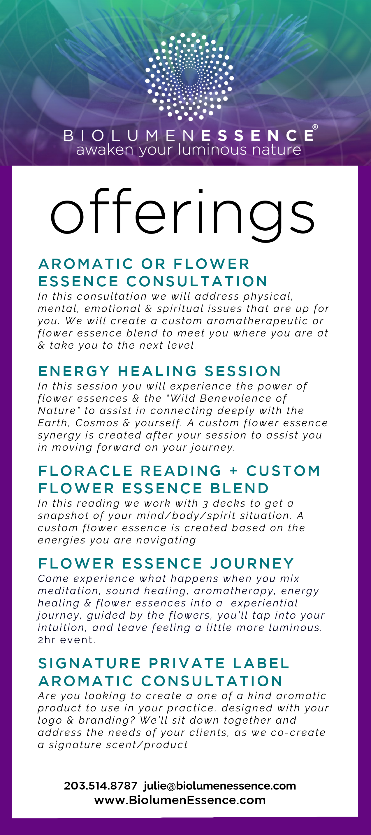 Please email julie@biolumenessence.com or call 203-514-8787 to schedule an appointment.