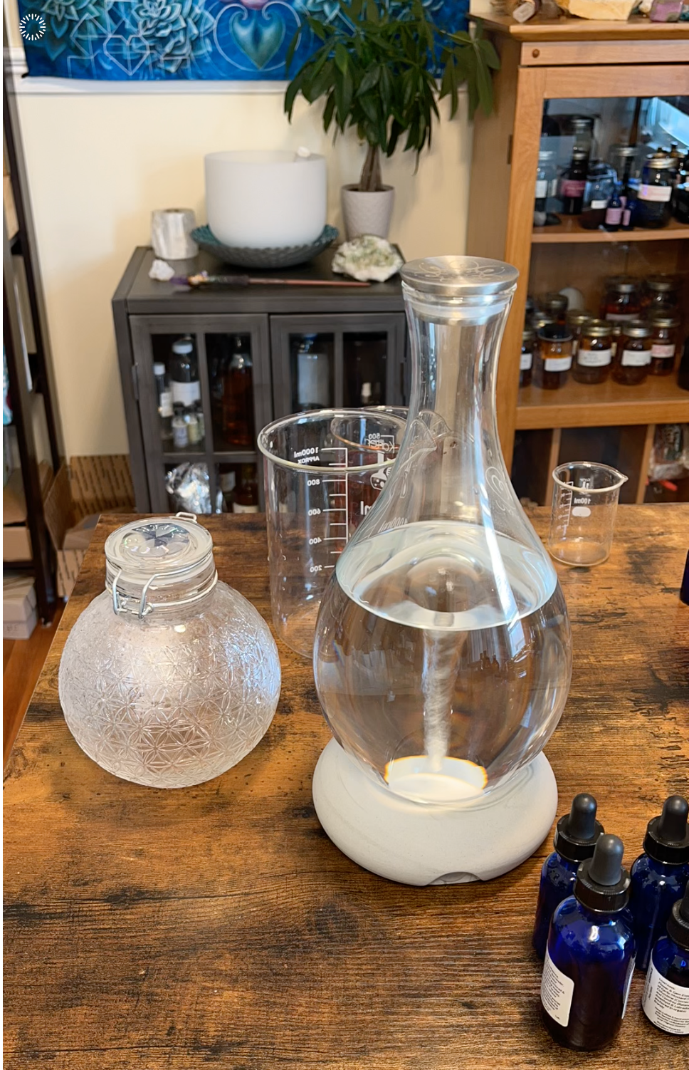 Our essences are created with vortexed spring water that has been structured & oxygenated in a MAYU SWIRL, stored in a vessel etched with the sacred geometry Flower of Life design, while listening to the songs of plants, with a PLANTWAVE device. They are charged with pyramid energy throughout the creation process and while they are being stored. They are placed on a custom designed charging plate, and infused with sound frequencies to further enhance, enliven & anchor in their healing qualities. The creation of these flower essences is a co-creative collaboration with the spirit/deva of the plant and the Wild~Benevolence of Nature.